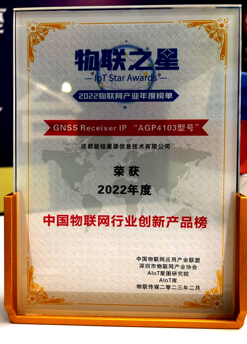 2023年5月17日,被譽(yù)為物聯(lián)網(wǎng)行業(yè)“奧斯卡”的物聯(lián)之星頒獎盛典在上海世博展覽館順利舉辦,旋極星源自主研發(fā)的AGP4103 GNSS Receiver IP***終從數(shù)百余家參評企業(yè)中脫穎而出,榮獲“2022年度物聯(lián)網(wǎng)行業(yè)創(chuàng)新產(chǎn)品榜”。
