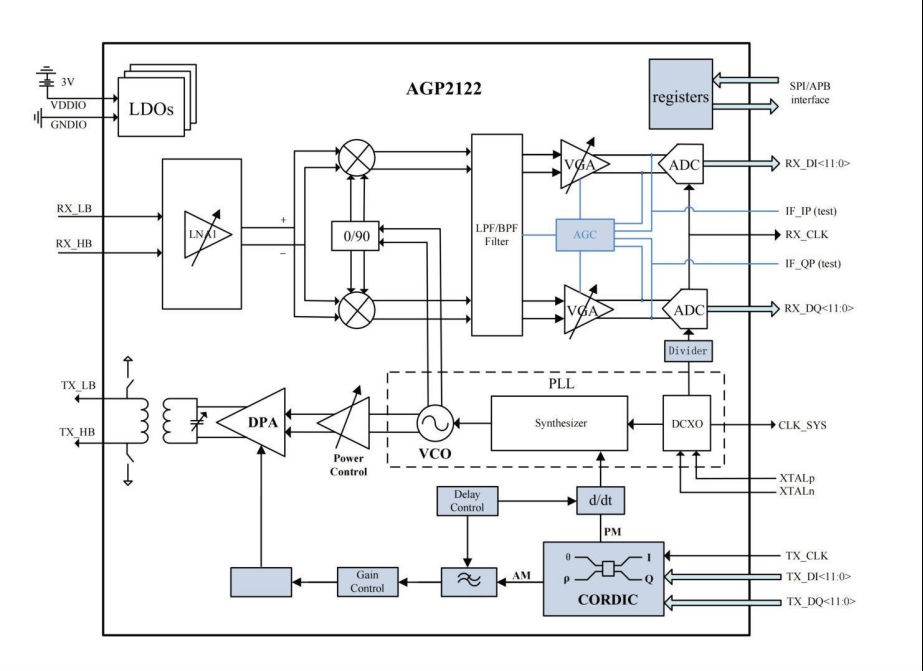 AGP2122 NB-I0T/GNSS Transceiver RF IP采用40nm ULP工藝,應(yīng)用于NB-I0T射頻信號收發(fā)和GNSS信號接收,兼容3GPP R15 NB-IOT FDD標準,支持R15標準FDD頻段,支持GNSS導(dǎo)航頻率(L1,B1,E1)。AGP2122單片集成CMOSPA(23dBm),采用低中頻/零中頻接收機和極坐標發(fā)射機結(jié)構(gòu)(Polar Transmitter),實現(xiàn)超低功耗設(shè)計,支持1.5V~3.6V供電電壓。AGP2122具有超高的集成度和超小的芯片面積,大幅簡化了NB模組設(shè)計難度,同時兼容GNSS衛(wèi)星導(dǎo)航應(yīng)用,降低了系統(tǒng)成本。RF IP內(nèi)部集成寬帶sigma delta小數(shù)鎖相環(huán)、鏡像抑制低中頻接收機、GNSS零中頻接收機、6.4MS/s12bit SAR ADC、帶通/低通濾波器、發(fā)射數(shù)字功率放大器(DPA)、SPI接口和射頻基帶數(shù)字接口,支持輸出功率-40dBm ~+23dBm調(diào)節(jié)。