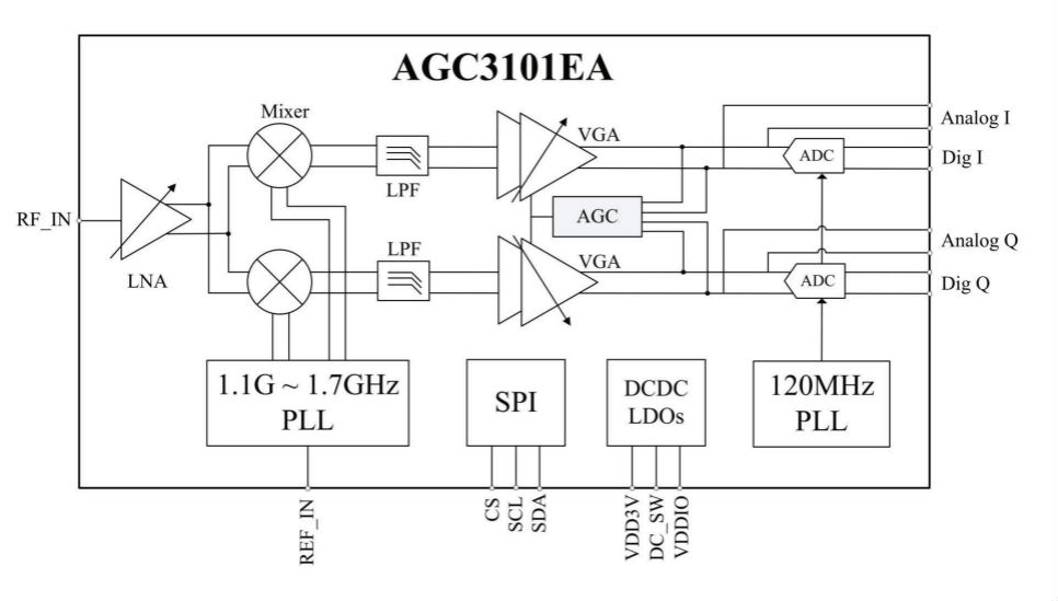 AGC3101 GNSS Transceiver采用130nm CMOS工藝,是一款高度集成的多模多頻段單通道寬帶GNSS射頻接收機(jī),完全滿足1.1GHz~1.7GHz頻段的衛(wèi)星導(dǎo)航信號(hào)接收。片上集成單通道接收機(jī),包括低噪聲放大器(LNA)及正交混頻器(MIXER)、低通濾波器(LPF)、自動(dòng)增益控制(AGC)、模數(shù)轉(zhuǎn)換器(ADC)、全集成小數(shù)分頻鎖相環(huán)和時(shí)鐘鎖相環(huán)等電路,支持模擬和數(shù)字中頻信號(hào)輸出。GNSS接收機(jī)可配置為高線性模式和低功耗模式,以滿足多種應(yīng)用需求。